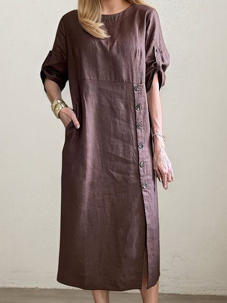 Women's Waisted Linen Cotton Long Sleeve Dress