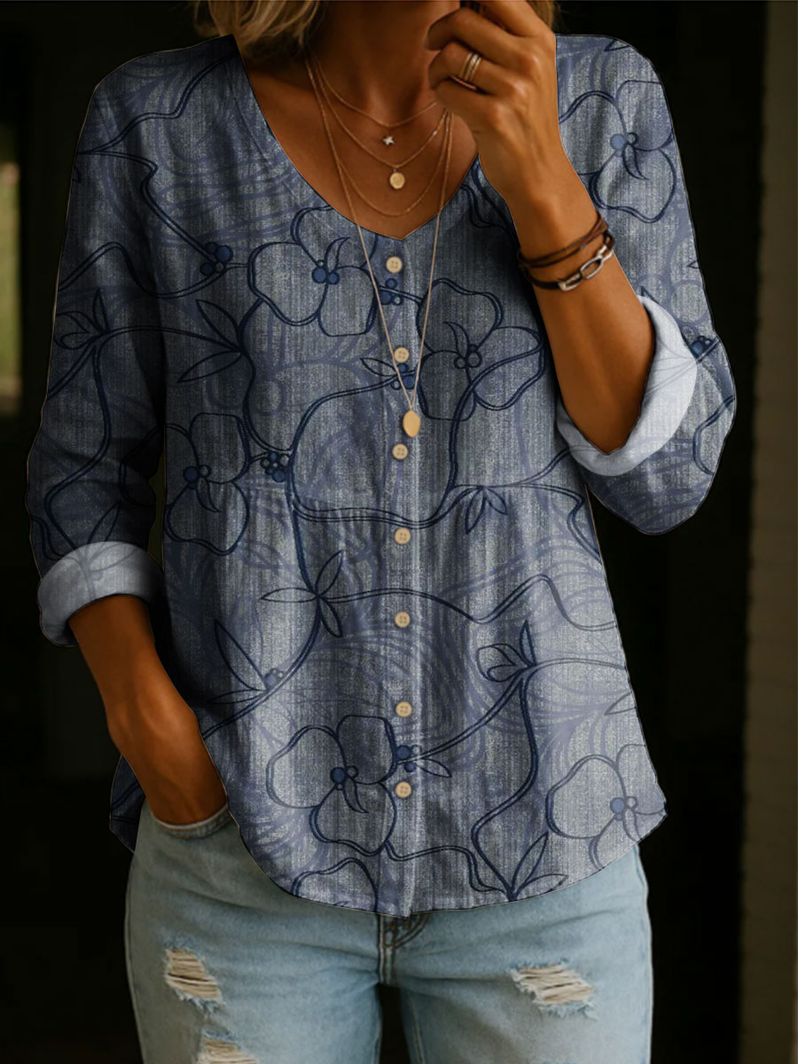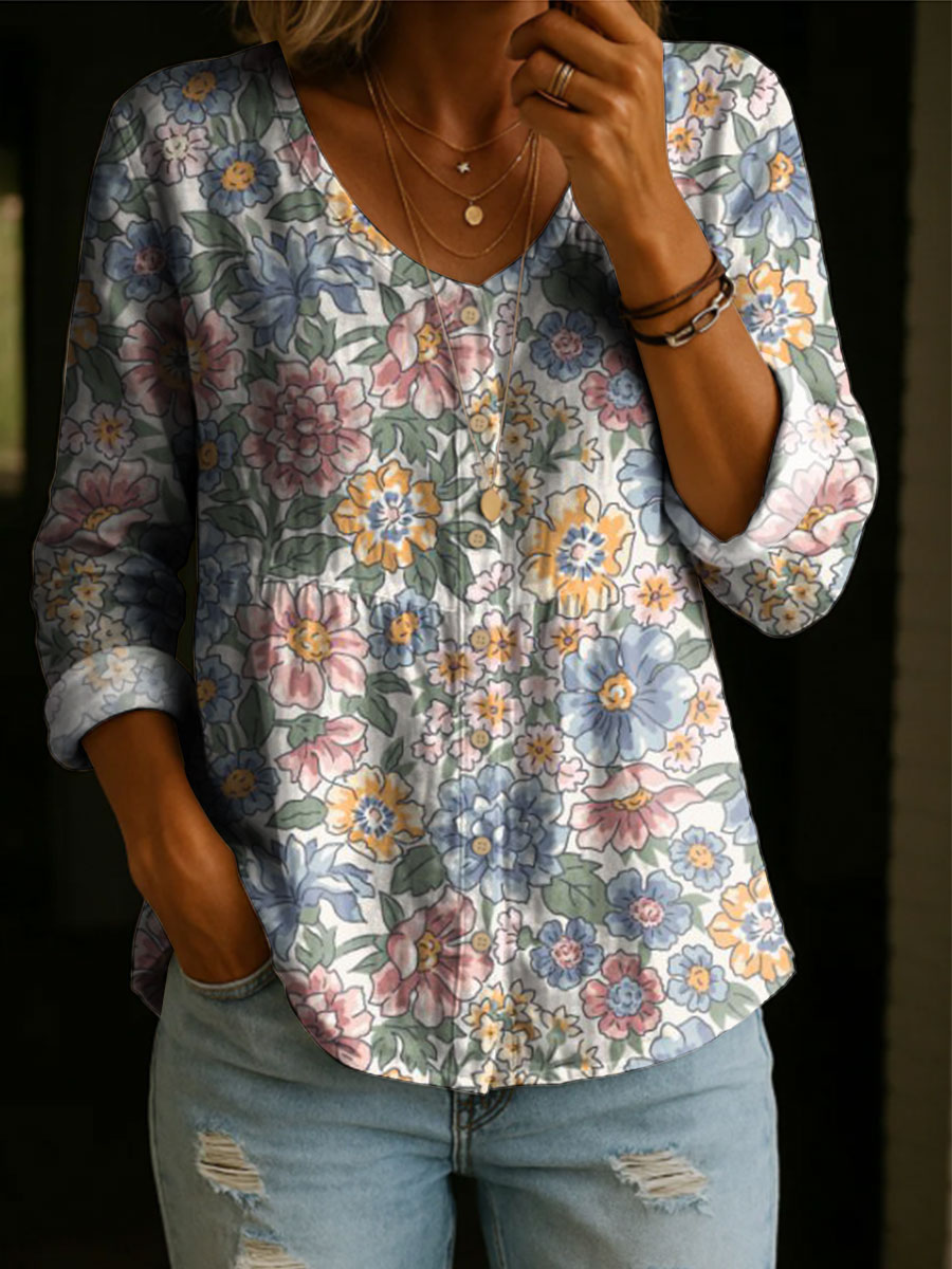 Women's Floral Pattern Art Print Casual Cotton Shirt